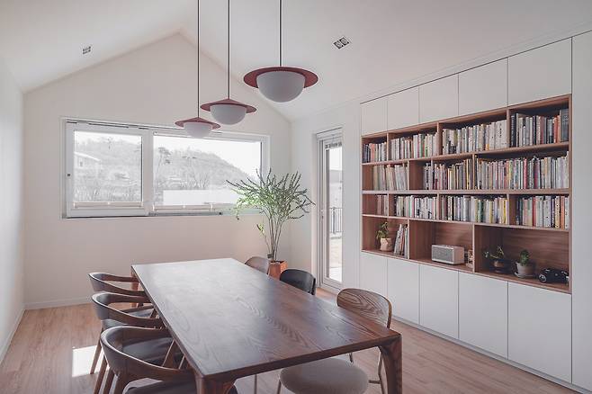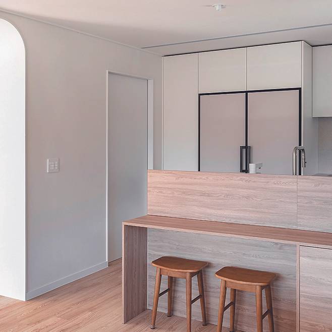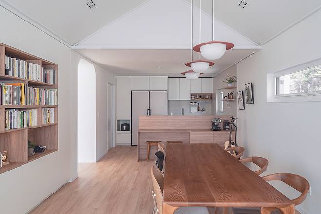 아치형 입구로 들어가면 아늑한 주방이 펼쳐진다. 미니멀한 분위기의 거실과 일체감이 느껴지는 주방은 한정된 공간에서 최대한의 실용성을 부여했으며 군데군데 포인트를 담아 심플하되 밋밋하진 않은 우드-화이트의 주방으로 완성했다. 잘 정돈된 공간은 기본적으로 부지런함이 동반돼야 하지만, 더불어 넉넉한 수납공간이 필수적이다. 이에 주방 안쪽에 자주 사용하는 가전제품 이외 다른 물건들을 수납할 수 있도록 다용도실을 설계해 한정된 공간의 주방이 언제나 깔끔함을 유지할 수 있도록 했다. 한편, 주방 천장과 비교해 다이닝룸의 천장은 박공지붕의 형태가 그대로 드러나 넓은 공간감이 느껴진다.