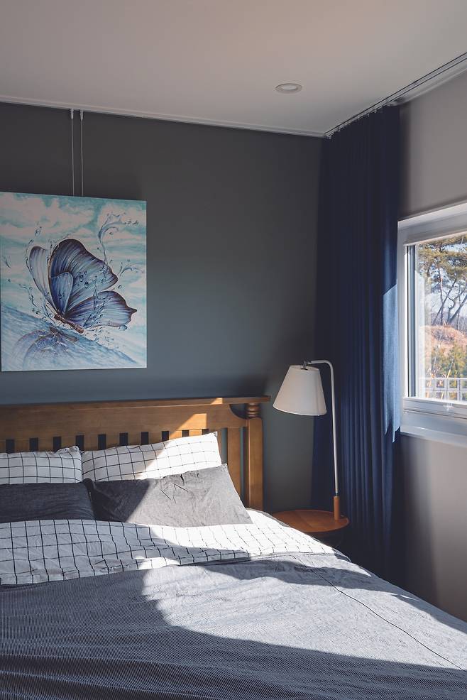 안방은 건축주의 개성이 강하게 드러난 공간이다. 일반적인 우드-화이트의 심플하고 아늑한 침실 대신 다크 그린 컬러의 벽지와 블루 계열의 패브릭이 조화롭게 어울리는 공간으로 연출했다. 이러한 포인트의 공간은 자칫 어두침침한 분위기를 예상할 수 있지만, 남향의 햇빛이 풍부하게 드리워져 오히려 안정감을 느끼게 해준다. 여기에 휴식을 중시하는 건축주를 위해 침실과 드레스룸, 화장실을 연결해 공간에 편리한 동선을 부여하되 화장실과 안방의 위치를 최대한 떨어트려 화장실의 소음에 수면이 방해받지 않도록 했다.