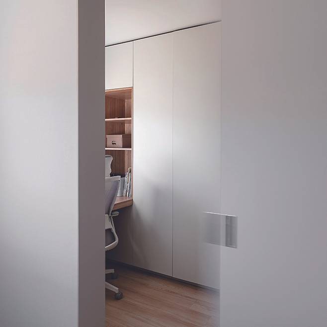 컴퓨터 작업을 많이 하는 건축주 부부는 별도의 서재 공간을 필요로 했다. 넓지 않아도 된다는 건축주의 의견에 드레스룸의 자투리 공간을 활용해 아늑하고 실용적인 서재를 완성했다. 협소하지만 창을 내고 별도의 수납공간을 계획해 쾌적하고 실용성 있는 장소로 만들었다.