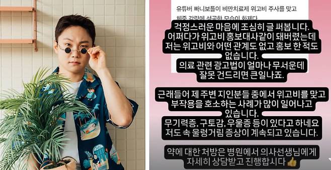 현재 비만치료제 위고비 열풍이 일고 있는 가운데 위고비로 체중 감량에 성공했던 유튜버 빠니보틀이 부작용 증상을 겪고 있다고 밝혔습니다.