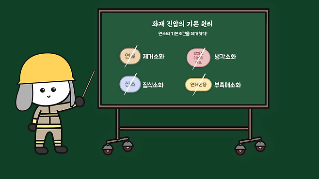 기본조건 중 하나라도 갖춰지지 않으면 연소하지 않는데, 이는 연소 중인 상황에서도 해당하므로 화재 진압의 기본 원리가 연소의 기본조건을 제거하는 일입니다, 그래서 소화기는 산소를 차단하고, 특수한 소화약제로 온도를 낮추어 화재를 진압하는 원리로 작동합니다.