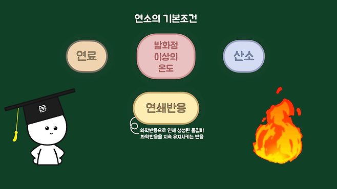 먼저 불이 발생하기 위해서는 연소의 기본조건을 충족해야 합니다. 연소에는 연료와 발화점 이상의 온도, 산소 등 세 가지 조건이 필수적이고, 연소가 계속 일어나기 위해서는 3요소 외에 연쇄반응도 필요합니다.