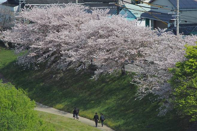 강변을 따라 벚꽃이 길게 이어져서 산채갛기 좋습니다. 성처럼 한 포인트에 몰리기보다 길게 분산돼서, 인파 스트레스가 상대적으로 덜합니다.