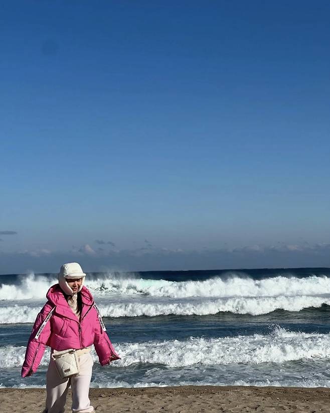 장서희는 푸른 하늘과 파도 속에서 돋보이는 강렬한 핫핑크 패딩으로 눈길을 끌었다.