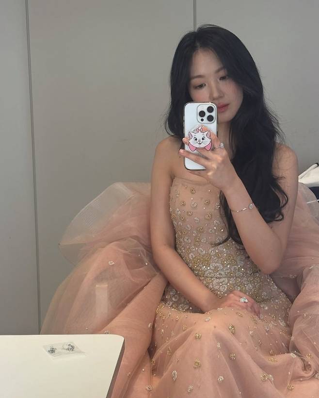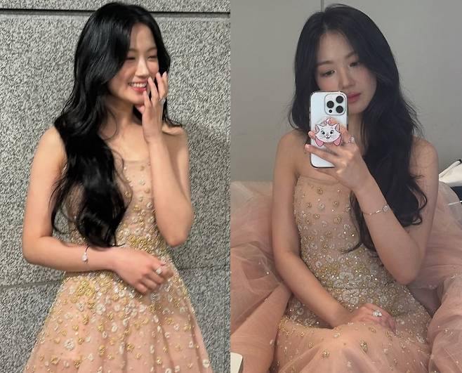 드레스는 허리선을 강조한 실루엣으로 슬림하면서도 자연스럽게 퍼지는 플레어 라인이 특징이며, 연한 베이지 컬러가 피부 톤과 조화를 이루며 청순한 이미지를 더욱 부각했습니다.
