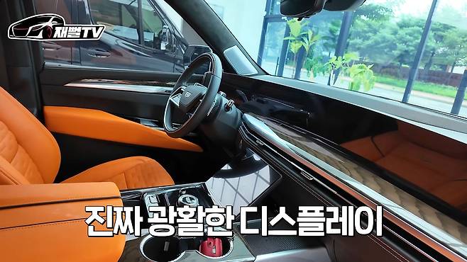 운전석에는 55인치 디스플레이가 탑재되어 있어서 미래지향적인 분위기를 연출합니다. 이 중 운전석은 약 35인치, 조수석은 약 20인치로 나뉩니다. 화면 라인과 우드 라인이 일자로 연결되어 있어서 마치 럭셔리한 집에서 4D 화면에 둘러싸여 운전하는 듯한 느낌을 받았습니다.