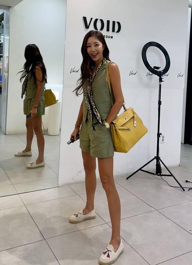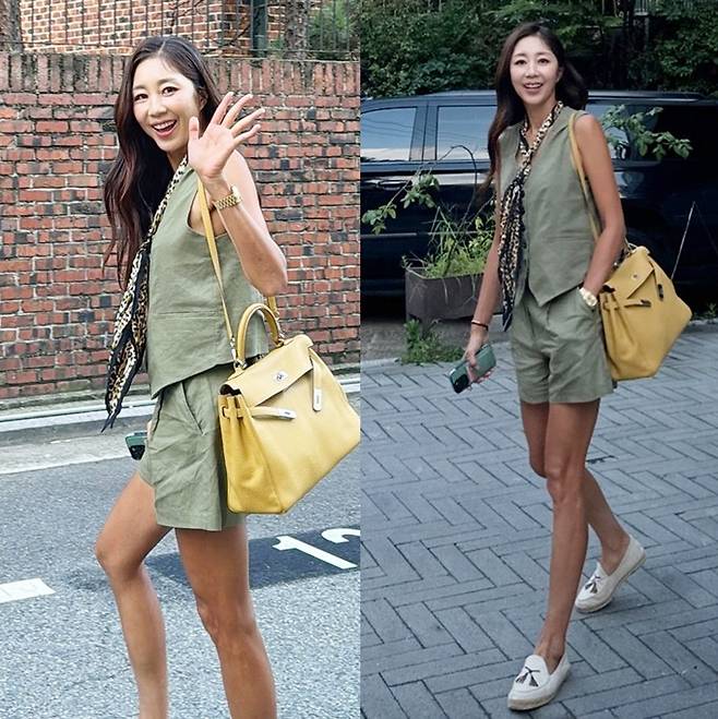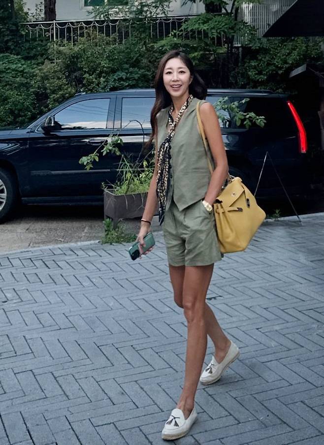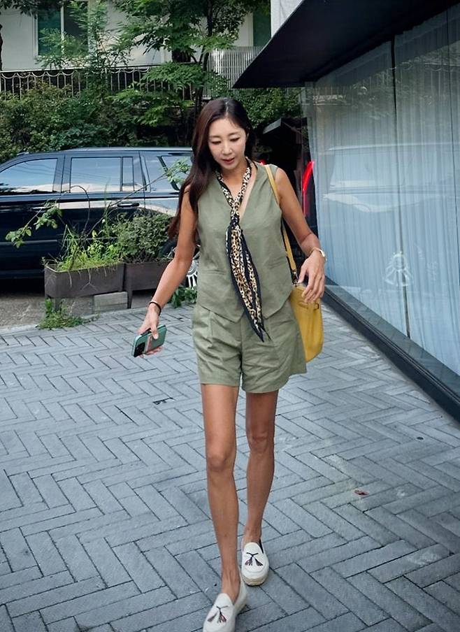 공개한 사진에서 전미라는 늘씬한 몸매에 카키 컬러의 짧은 쇼츠와 베스트 셋업에 목에 두른 스카프로 포인트를 준 스타일로 시원하면서도 멋스러운 한여름 하객룩을 완성했다.