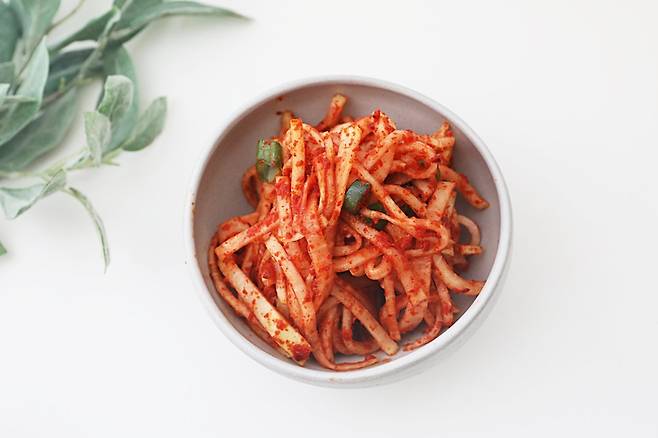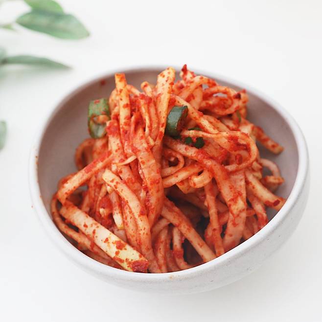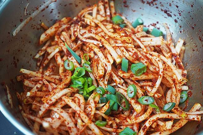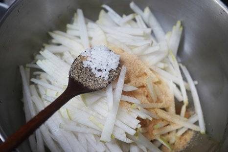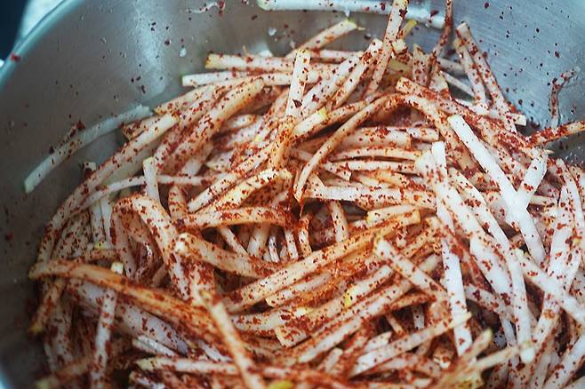 이 상태로 무를 살살 조물조물 버무려주세요. 설탕과 소금이 무의 수분을 쏙 빼주면서 기본 맛을 잡아준답니다.