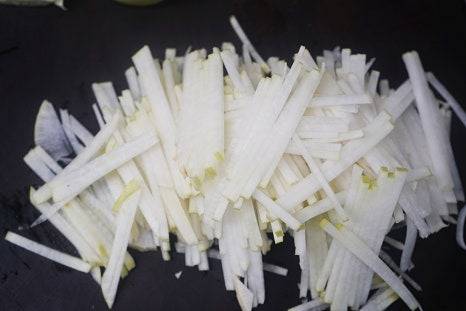 껍질째 드셔도 되지만 깔끔한 맛을 원하시면 깎아주는 게 더 좋아요. 무를 반으로 자른 뒤 얇게 편으로 썰어 채를 썰어줍니다. 채칼을 사용하면 금방 끝나요! 이렇게 썰어놓으면 무 한 개로도 꽤 많은 양이 나오니 온 가족이 넉넉히 먹을 수 있겠죠?