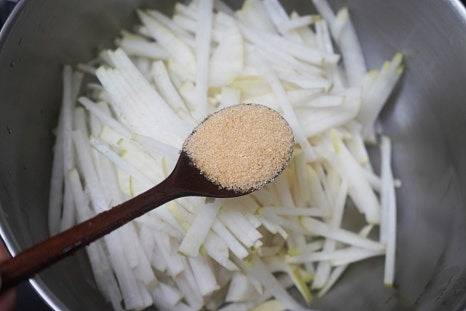 큰 볼에 썰어놓은 무를 담고 설탕 4스푼, 천일염 반 스푼을 넣어주세요.