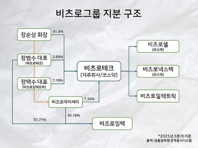 이런 계열사 재편이 승계와 연결되는 지점은 비츠로테크의 지분 구조에 있다. 지난해 3분기 기준 비츠로테크의 최대주주는 장 회장으로 지분 41.4%를 보유하고 있다. 이 외에 차남 장택수 대표 7.18%, 비츠로아이씨티 7.34%, 장남 장범수 대표 3.88% 등 특수관계인 지분이 더해지면 과반을 형성한다.