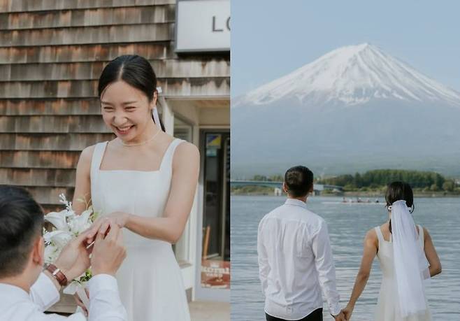 함께 공개한 사진에는 웨딩드레스를 입은 메이제이가 예비신랑의 손을 꼭 잡고 설산을 바라보고 있는 모습, 손에 반지를 끼워주는 예비신랑을 향해 환하게 웃는 모습이 담겨 행복한 예비신부의 설렘을 엿보게 한다.