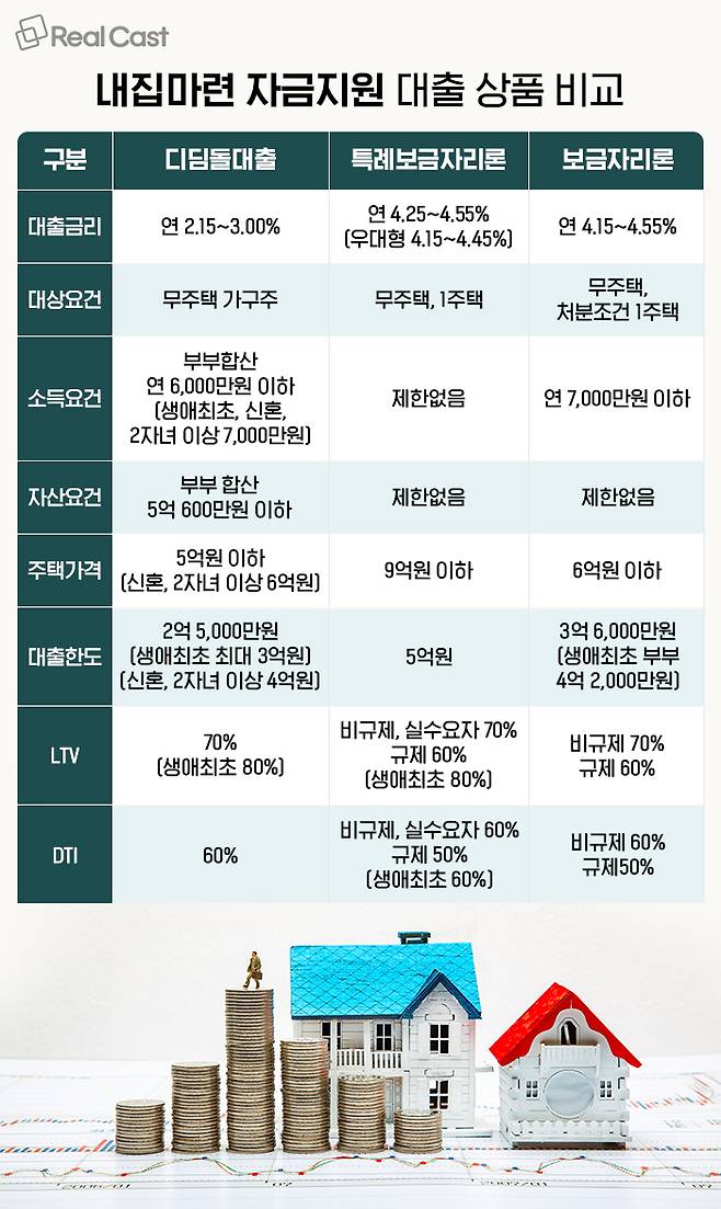 특례보금자리론이 출시 두 달 만에 전체 중 65%를 소진한 것으로 알려지면서 인기를 실감하고 있습니다. 남은 35% ‘막차’에 탑승할지 고민하는 수요자들에게 도움이 될 수 있도록 리얼캐스트가 디딤돌 대출, 기존 보금자리론 상품들과 어떻게 다른지 비교했습니다.