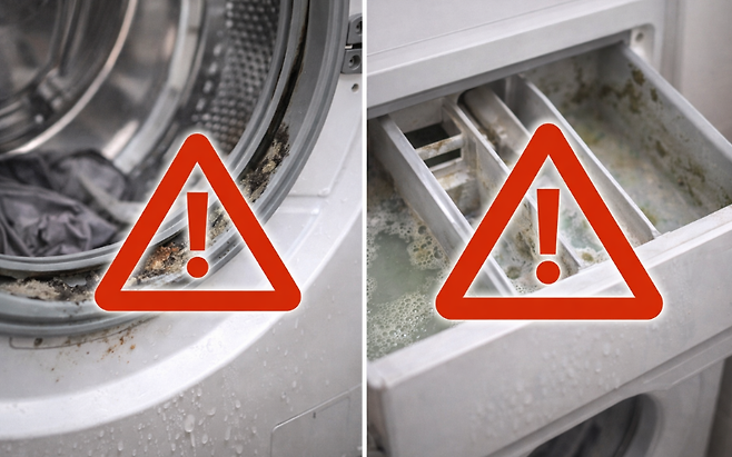 곰팡이는 이 환경을 가장 좋아합니다. 특히 드럼 세탁기는 구조상 내부 건조가 느려 더 취약합니다.
