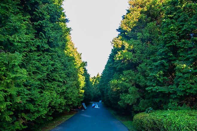 제동목장 입구에는 약 150m 정도 거대한 삼나무가 양쪽으로 빽빽하게 심겨 있어 분위기를 더하고 있습니다.
