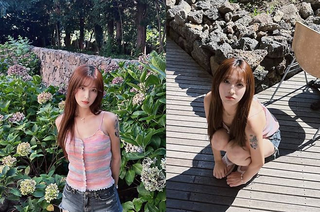 돌담과 수국이 어우러진 제주 감성의 배경, 시크한 표정과 청순한 스타일이 공존하며 또 다른 반전미를 자아낸다.