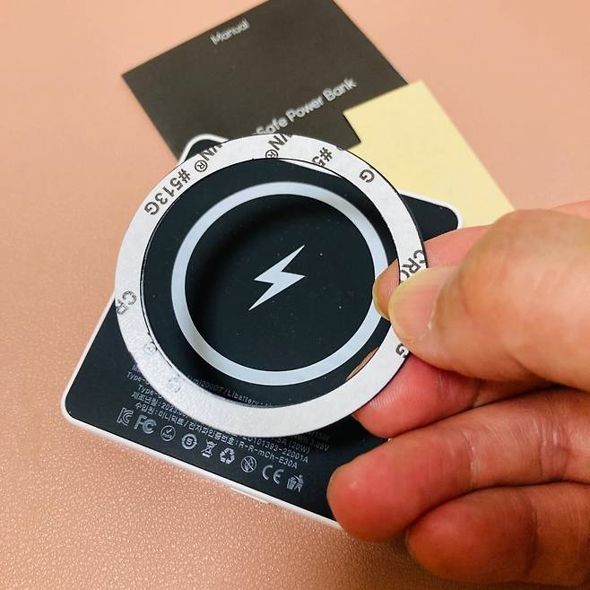제품을 열면 보조배터리와 케이블, 설명서만 단촐하게 들어 있습니다. 제품의 포장 상태부터 깔끔하면서도 정갈하네요. 패키지 안쪽에는 브랜드 스토리를 멋진 문장으로 보여주고 있습니다. 일반 보조배터리에서는 접근하지 않는 방법이며, 제품의 경험을 중요시하는 회사 같습니다. 설명서 봉투를 열면 자석 링이 포함되어 있는데요. 맥세이프를 지원하지 않는 스마트폰에도 부착하여 충전을 하라는 의미로 넣어 주었네요. 그런데 링의 색상이 검정색이라 스마트폰의 색상과 어울리지 않을 수도 있을 것 같습니다. 색상별로 넣어 주었으면 어떨까 생각했어요.
