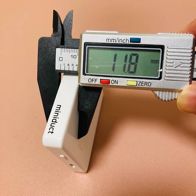 크기와 디자인이 이 제품의 모든 것을 말해줍니다. 성인 손 안에 쏙 들어가는 크기로 신용카드보다도 작습니다. 두께도 1센티미터를 조금 넘겨 스마트폰에 부착해도 그립감을 해치지 않습니다. 언뜻 보기에는 정사각형인데 실제로 재어보면 완벽한 정사각형은 아니네요.