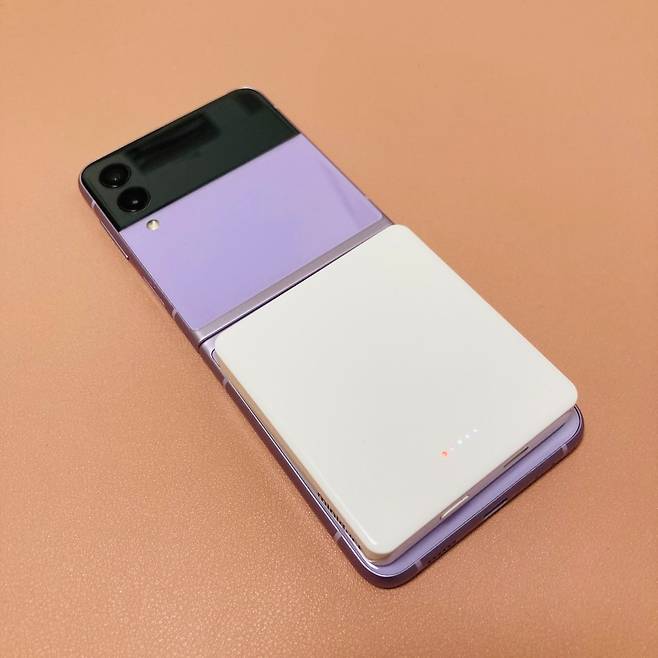 아이폰13 미니에 부착하면 충전 애니메이션도 잘 연출해 줍니다. 이 밖에도 아이폰 SE 2세대나 갤럭시 Z플립과도 연결해 봤는데 맥세이프가 지원되지 않아도 충전에는 문제가 없었습니다. 특히 갤럭시 Z플립과는 사이즈를 맞춘 것처럼 딱 들어맞아 폰의 색깔만 맞춘다면 삼성 정품 보조배터리로 착각할 정도입니다. 맥세이프의 자석 힘도 강해서 일부러 떼어 놓기 전에는 잘 분리되지 않아 이동 중 분실의 우려가 적네요. 충전 속도는 최대 20W의 무선 충전을 지원하여 시원시원하게 충전이 됩니다. 하지만 맥세이프가 아닌 스마트폰에 자석 링으로 무선 충전을 하면 맥세이프보다는 다소 느리게 충전되는 것 같았습니다. 이는 무선 충전 자체의 한계점으로 무선 충전 시 스마트폰과 충전기 사이에 간격이나 이물질이 있으면 충전에 방해가 되기도 합니다.