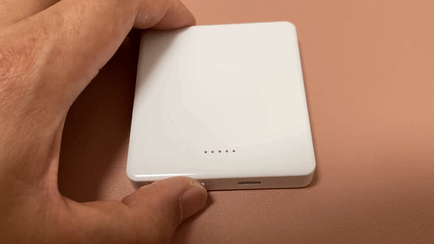 일반적인 보조배터리는 케이블을 연결하면 자동으로 전원이 켜지지만, 미니덕트 맥세이프 보조배터리는 주로 무선 충전을 하는 제품이라서 스위치로 전원을 켜야 합니다. 제품 측면의 작은 버튼을 한번 누르면 전원이 켜지며, 두 번 누르면 전원이 꺼집니다. 보통 전원 버턴을 계속 눌러야 꺼지는데 이 제품은 특성상 핸드백이나 파우치 안에서 버튼이 눌릴 수 있으므로 두 번 누르는 방식으로 되어 있습니다. 전원과 유무와 배터리 상태는 전면의 작은 5개의 LED 램프로 알려주는데요, 조명도 깔끔하여 한 눈에 상태를 파악할 수 있습니다.