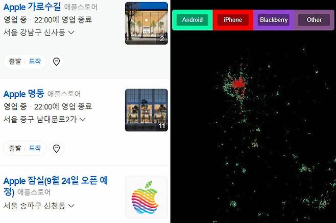 공개된 사진은 다름 아닌 우리나라 스마트폰 이용자들이 이용하고 있는 브랜드가 지도에 표시된 것이었는데, 빨간색으로 표시된 아이폰 이용자는 서울 지역에서만 뚜렷하게 나타나있었다.