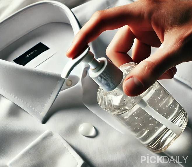 그다음 얼룩부위에 손소독제를 1~2펌프 짜준다. 이후 깨끗한 천으로 얼룩부위를 두드리며며 닦아주면 얼룩이 효과적으로 제거된다. 알코올을 옷에 강하게 문지르면 옷감이 손상 될 수 있으니, 가볍게 톡톡 문질러 닦아주는 것이 좋다.
