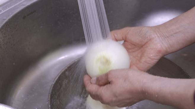먼저 싱싱한 양파를 준비해 주세요. 그리고 껍질을 모두 벗긴 후에 물에 깨끗이 씻어 주세요. 씻은 후엔 물기를 완전히 제거해 놓으세요.