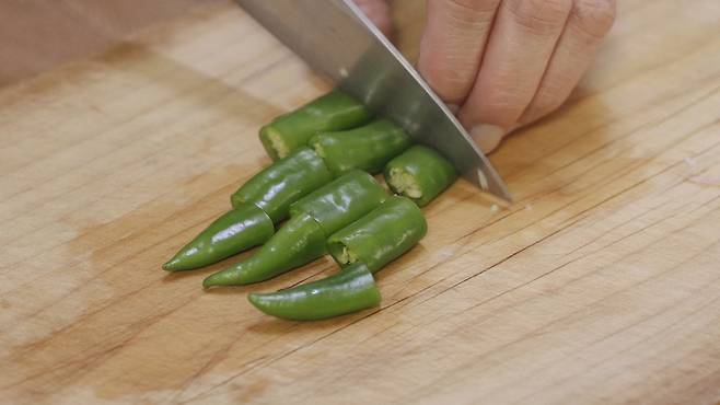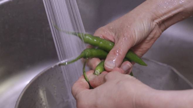 고추는 꼭지를 제거하고 물에 깨끗이 씻어 주세요.