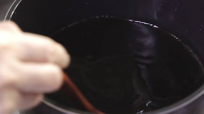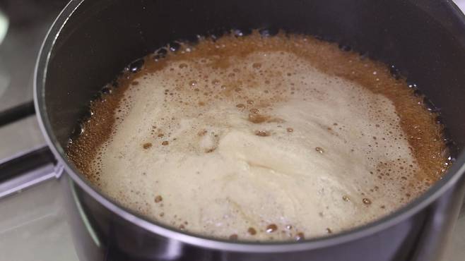 '강불'에서 설탕이 녹도록 저어 주세요. 한소끔 끓어오르면 바로 불을 꺼주세요. 오랫동안 끓이면 맛이 진해질 수 있어요. 그래서 반드시! 거품이 끓어오를 때 바로 꺼주는 것이 중요해요.