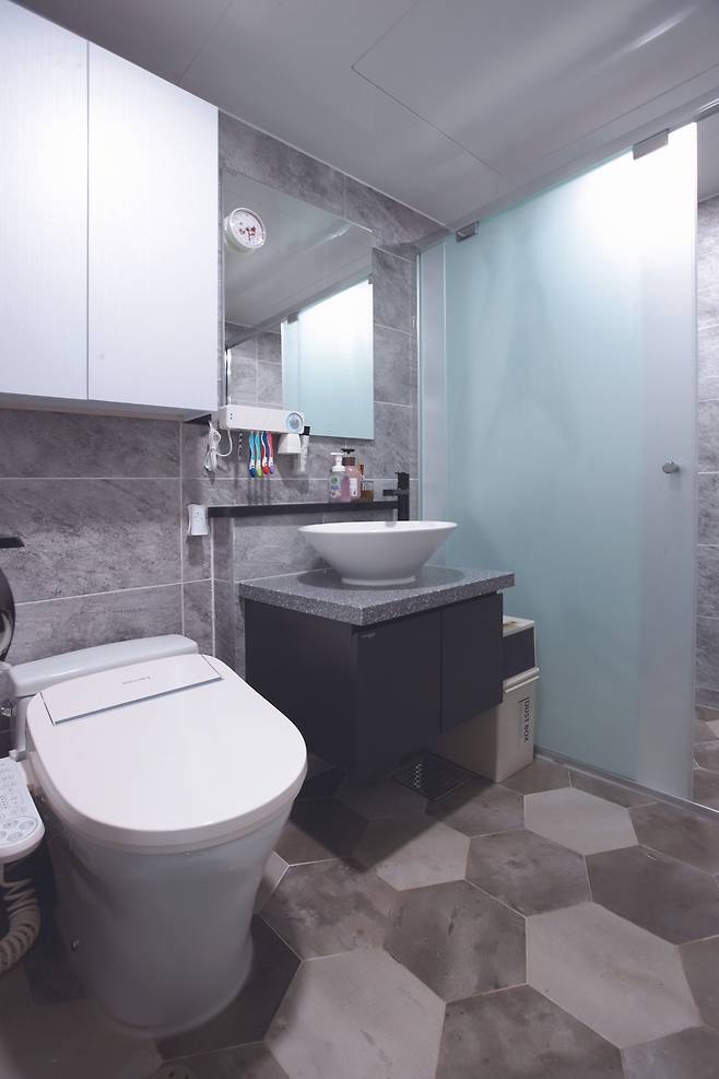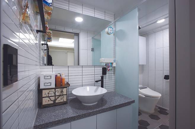 넓어 보이는 효과를 주기 위해 벽면 타일은 깨끗한 화이트로 마감했고, 바닥 타일은 단조로움을 피하려고 육각 타일을 사용했다. 검은색 수전은 디자인을 모던하게 완성시키는 디테일이다. 세면 공간과 샤워 공간을 분리해 실용성을 높였으며 유리 파티션과 커튼을 활용해 공간이 깔끔하게 유지될 수 있도록 했다.