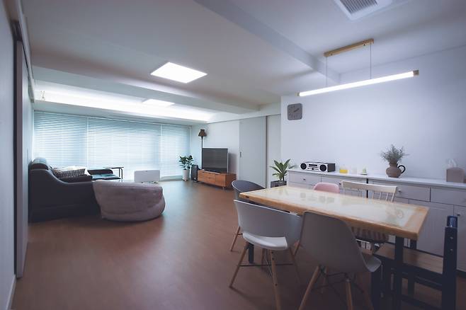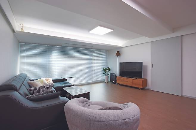 낮은 천장의 리스크를 줄이기 위해 매입조명을 배제하고 직부 조명을 설치했다. 그리고 자연스러움과 실용성을 위해 낮은 원목 TV장, 깊이 있는 컬러의 가죽 소파, 감성을 더하는 라운드를 구성했다. 특히, 활동성이 강한 아이들을 위한 곳이라서 최대한 공간을 비웠고 변화가 필요할 때는 가구를 조금씩 이동하며 유연하게 대응할 수 있도록 했다.