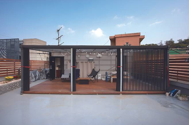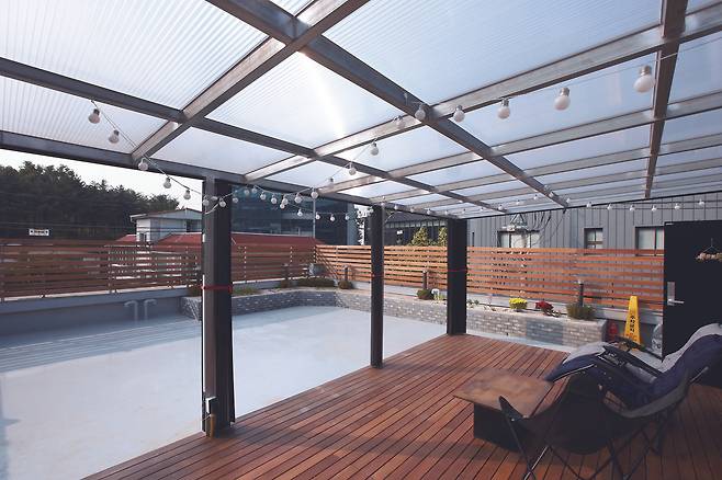 우드 데크가 깔린 공간은 실내 거실에서 이어지는 또 하나의 확장된 공간처럼 느끼게 한다. 충분한 넓이의 데크는 필요할 때 개폐식 문을 열면 더욱 개방된 공간이 된다. 한낮은 따뜻하고 저녁에는 운치 있는 조명이 은은하게 빛나는 아늑한 공간으로 변하고, 의자에 앉아 멍하니 하늘을 바라보는 것만으로도 하루의 피로가 풀릴 것 같은 공간이다.
