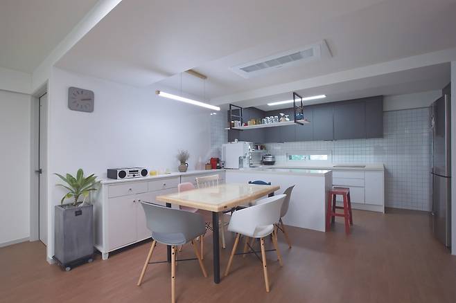 주방의 큰 테이블은 식사 때나 공부할 때나 가족끼리 함께할 때 매우 유용하다. 주방은 삶을 나누는 공간, 대화가 오가고 추억이 쌓이는 공간으로 거실보다 더 유용한 곳이다. 사람들은 도심 속에서 바쁜 일상을 살아가지만 가족이 모여 따뜻한 밥 한 끼를 나누는 순간만큼은 세상의 속도를 잠시 늦출 수 있다. 이곳 주방은 그렇게 계획됐다.