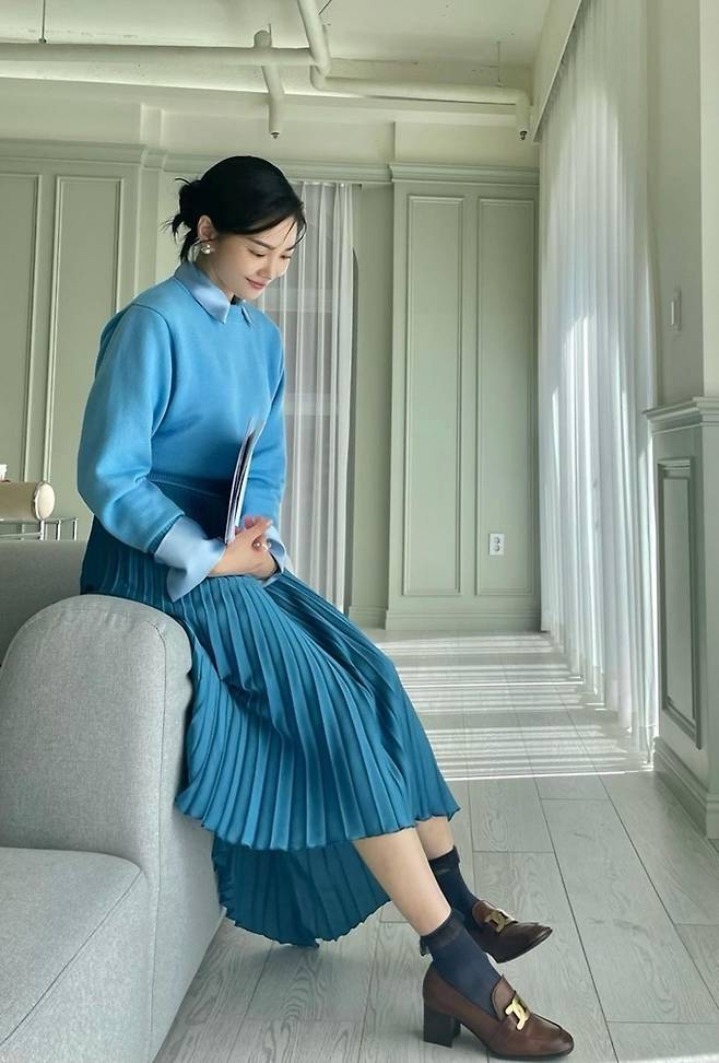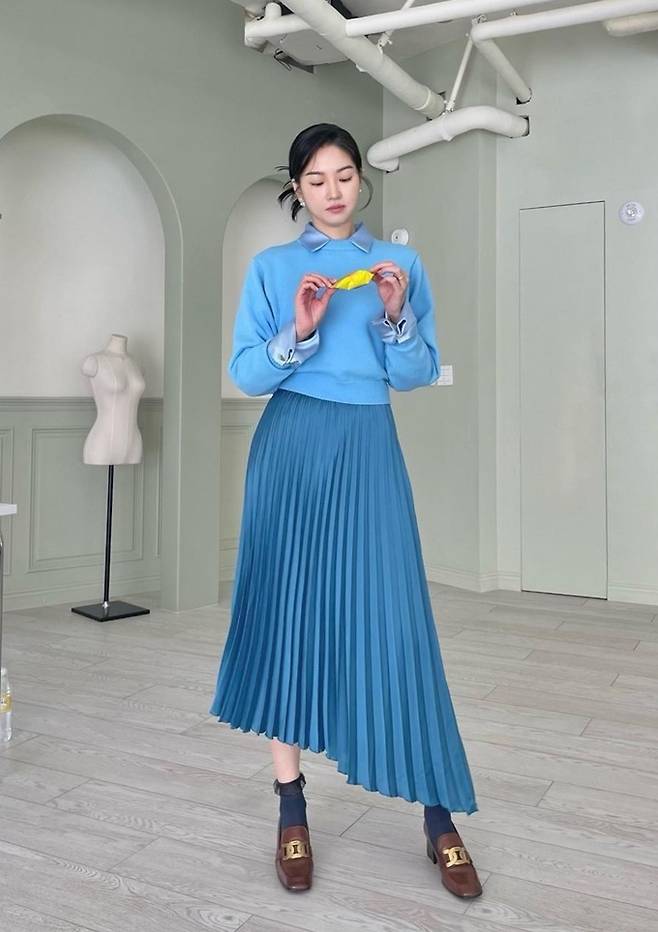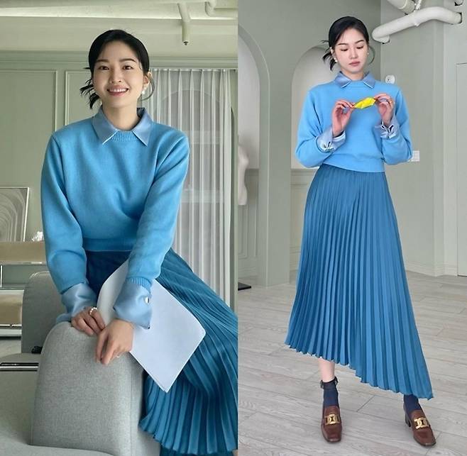 공개한 사진에서 류이서는 깔끔하게 뒤로 올려 묶은 헤어 스타일에 블루 톤의 플리츠 스커트와 셔츠에 블루 컬러의 니트를 매치해 청순하면서도 화사한 톤온톤룩을 완성했다.