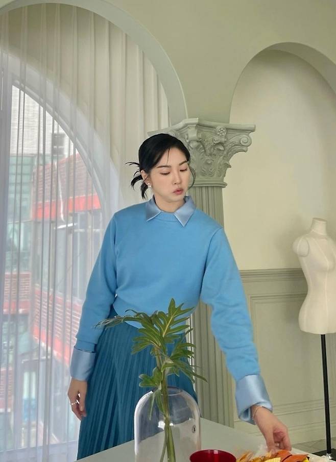 그룹 신화 전진의 아내 류이서가 블루 톤의 톤온톤 스타일로 화사한 청순미를 드러냈다.