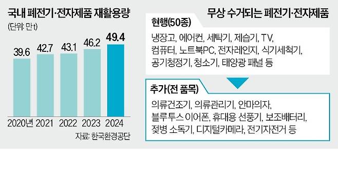 환경성보장제는 2008년 냉장고 세탁기 등 10개 품목으로 출발해 2014년 27종, 2023년 50종 등 대상 품목을 늘렸다. 하지만 새로운 전자제품 출시가 잦아져 기존 나열식 지정 방식으로는 재활용 체계에서 누락되는 제품이 급격히 늘었다. 이에 정부는 올해 4월 ‘전면포괄 방식’(오픈스코프)으로 관련 시행령을 개정했다.