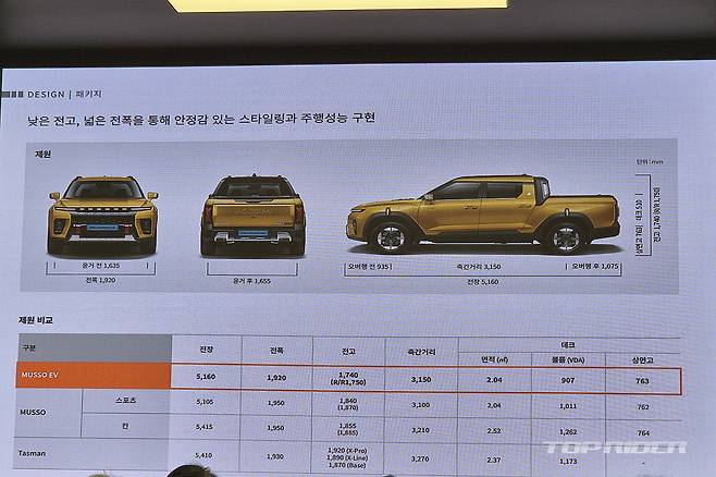 먼저 무쏘 EV의 구성을 살펴보면 철저히 국내 화물차 법규에 포함되기 위해 설계될 것을 확인할 수 있다. 법규상 화물칸의 바닥면적은 최소 2㎡, 승차공간과 화물공간이 분리되어야 한다. 무쏘 EV의 적재공간은 2.04㎡, 무쏘 스포츠 2.04㎡, 칸 2.52㎡, 타스만 2.37㎡로 모두 2㎡ 확보했다.