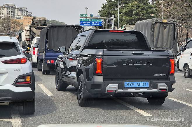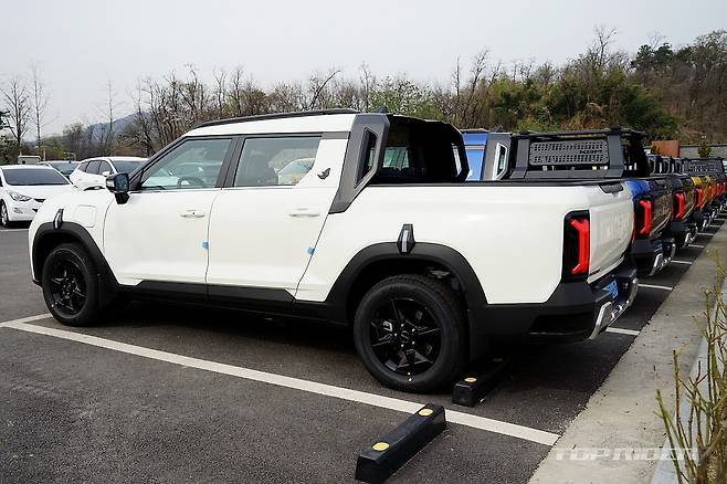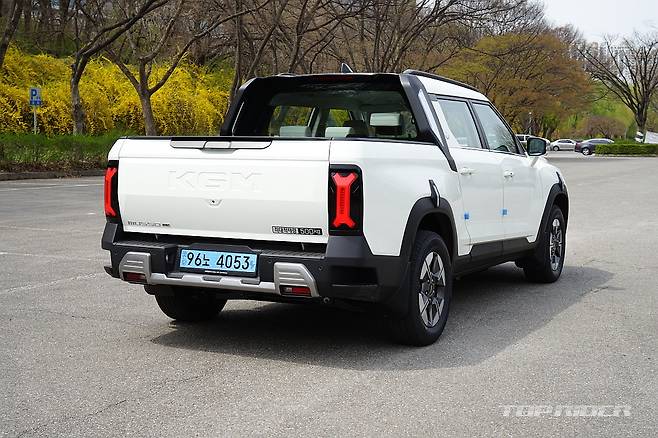 후면부는 가장 완성도 높은 디자인을 보여준다. 범퍼 코너면에 발을 딛을 수 있는 공간을 마련하고, 적재함 상단은 공력성능 개선을 위한 디테일도 갖췄다. 휠하우스의 디자인 요소는 코뿔소를 연상케한다. 적재함 공간은 무난하나, 바닥 손상 방지를 위한 스프레이 베드의 부재는 아쉽다.