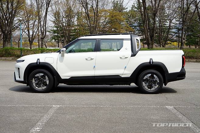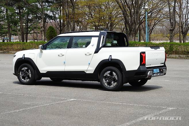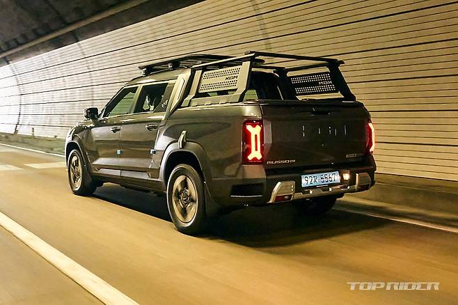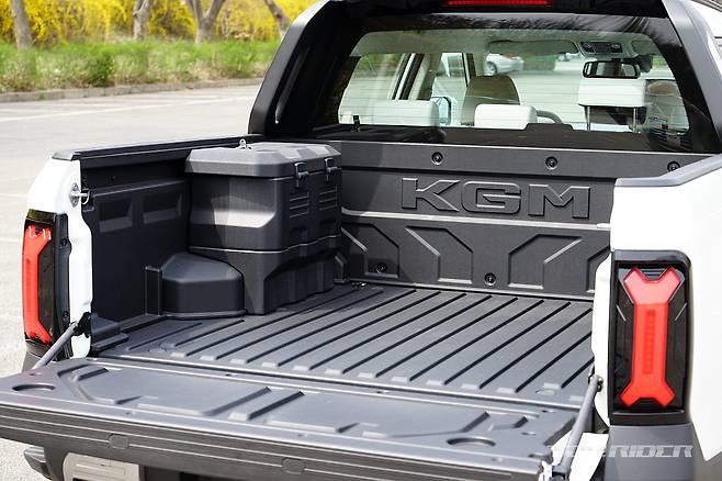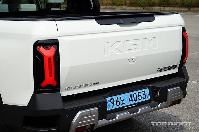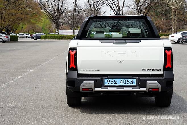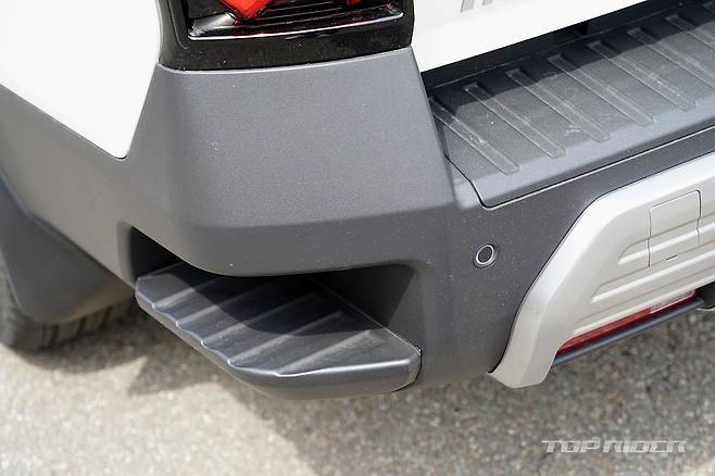 후면부는 가장 완성도 높은 디자인을 보여준다. 범퍼 코너면에 발을 딛을 수 있는 공간을 마련하고, 적재함 상단은 공력성능 개선을 위한 디테일도 갖췄다. 휠하우스의 디자인 요소는 코뿔소를 연상케한다. 적재함 공간은 무난하나, 바닥 손상 방지를 위한 스프레이 베드의 부재는 아쉽다.