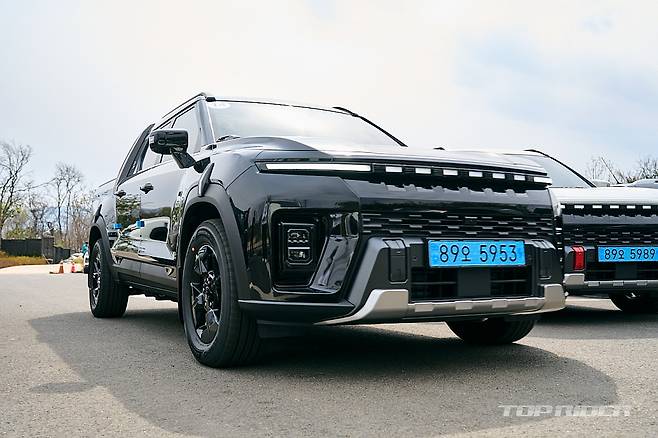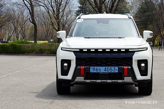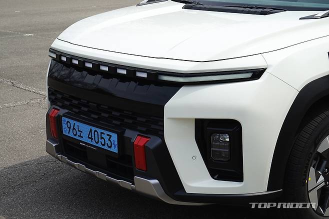 전면부 디자인은 토레스 EVX와 유사한데, 견인 후크처럼 생긴 빨간 부분은 디자인 요소다. 토레스 EVX와 헤드램프 위치가 동일하나, 광량을 늘려 시인성을 개선했다. 주간주행등의 반투명 아크릴 소재는 투명한 것으로 교체하거나, 향후 보다 고급스러운 소재로 변경하면 좋을 것 같다.