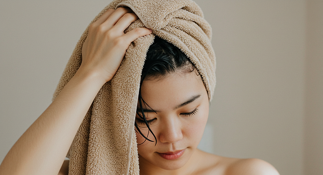 젖은 머리를 수건으로 비틀거나 심하게 비비면 모낭과 모근에 큰 자극을 주어 빠짐·갈라짐이 심해집니다.