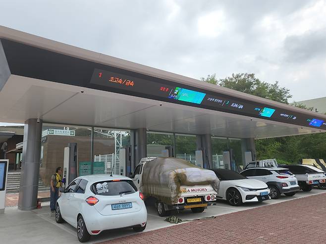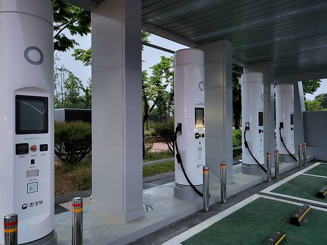 | ▲ 고속도로 휴게소에서 전기차들이 충전하고 있다. |