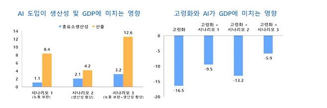 연합뉴스 보도에 따르면 고령화·저출생에 따른 노동 공급 감소가 2023∼2050년 한국 GDP를 16.5% 깎아내릴 것으로 추정되는데, AI가 성공적으로 생산성과 산출을 늘리면 이 감소 폭도 5.9%까지 줄일 수 있다는 게 한은의 분석이다.