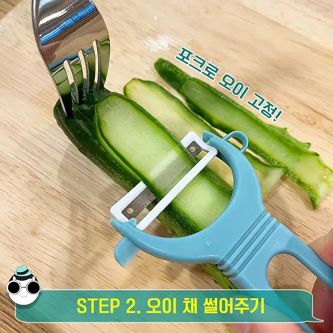 앞서 말한 것처럼 포크로 오이를 꽂아주고 감자칼을 이용해서 얇고 길게 채쳐주세요!