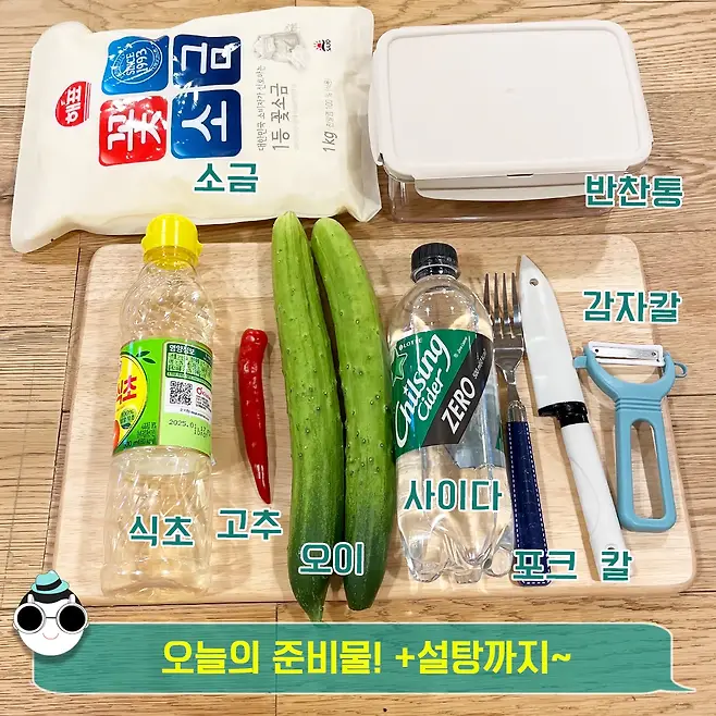 준비물 : 오이, 제로 사이다, 감자칼, 고추, 소금, 설탕, 식초