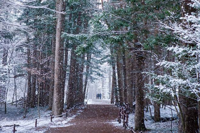 약 1km에 못 미치는 길이지만 가늘고 곧게 뻗은 전나무들이 인도하는 숲길은 마치 동화 속을 거니는 듯한 기분을 선사하죠. 특히 눈 내리는 겨울에는 더욱 그런 것 같습니다. 봄에는 벚꽃 터널, 여름에는 시원한 숲길, 가을에는 낭만적인 단풍, 겨울에는 눈 내린 풍경을 제공하여 계절을 타지 않죠.