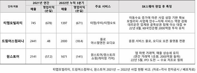 SK스퀘어는 2021년 기업 분할 당시 SKT 산하 비통신 회사들을 자회사로 맞이했다. 당시엔 주로 '대어(大漁)'인 SK하이닉스 편입에 관심이 쏠렸다. 하지만 티맵모빌리티, 드림어스컴퍼니, 원스토어 등 일반 소비자 중심 플랫폼으로서 향후 폭넓은 생태계 확장성과 성장 잠재력을 지닌 것으로 평가되는 회사들에 대한 기대도 따랐다. SK하이닉스가 SK스퀘어의 안정적인 '캐시카우(현금창출원)'로 기대됐다면, 이들 회사는 SK스퀘어의 미래 성장동력, 투자 판단, 잠재력 발굴 전략 등을 확인해 볼 가늠자였기 때문이다.