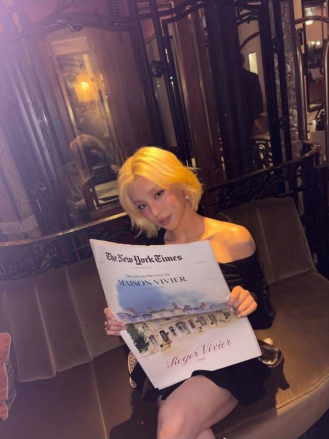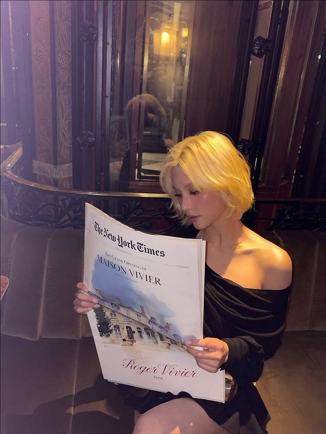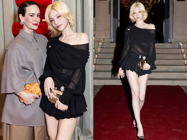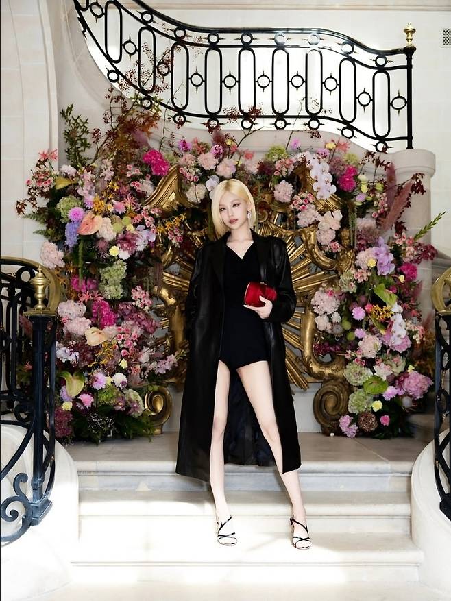 헤어는 금발 보브컷으로 연출해 파리지앵 감성과 케이팝 스타의 존재감을 절묘하게 조화시켰습니다.