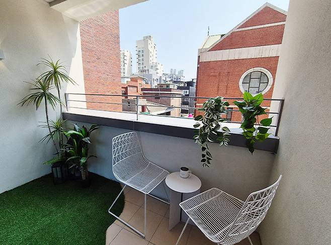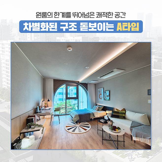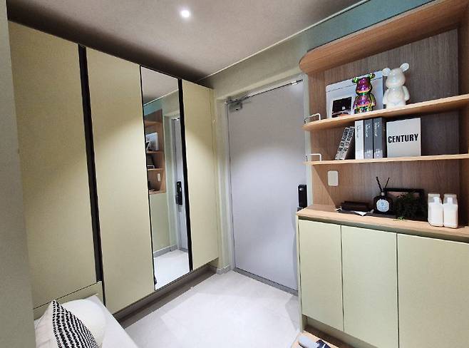 먼저 A타입부터 살펴봤습니다. 리마크빌 당산의 A타입은 전용 27.04㎡로 서비스 면적을 포함해 실사용면적이 33.4㎡(10.1평)에 달합니다. 일단 내부로 들어가 보면 생각보다 넓은 공간에 놀라게 됩니다. 실내는 3인용 소파와 싱글 침대를 놓아도 넉넉하며, 한쪽에는 책상과 각종 수납장을 둘 공간이 마련돼 있습니다.