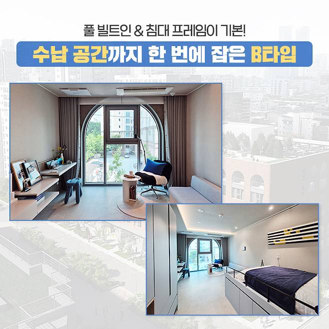 다음으로 B타입은 전용 23.46㎡의 원룸으로 실사용면적 28.9㎡(8.6평)의 아늑한 공간을 제공합니다. B타입은 공간 효율성이 매우 뛰어난 곳입니다. 특히 기본 풀 빌트인 가구 및 가전을 포함해 침대 프레임을 기본으로 제공해 입주 시 매트리스와 침구 등만 갖추면 돼 편리합니다.